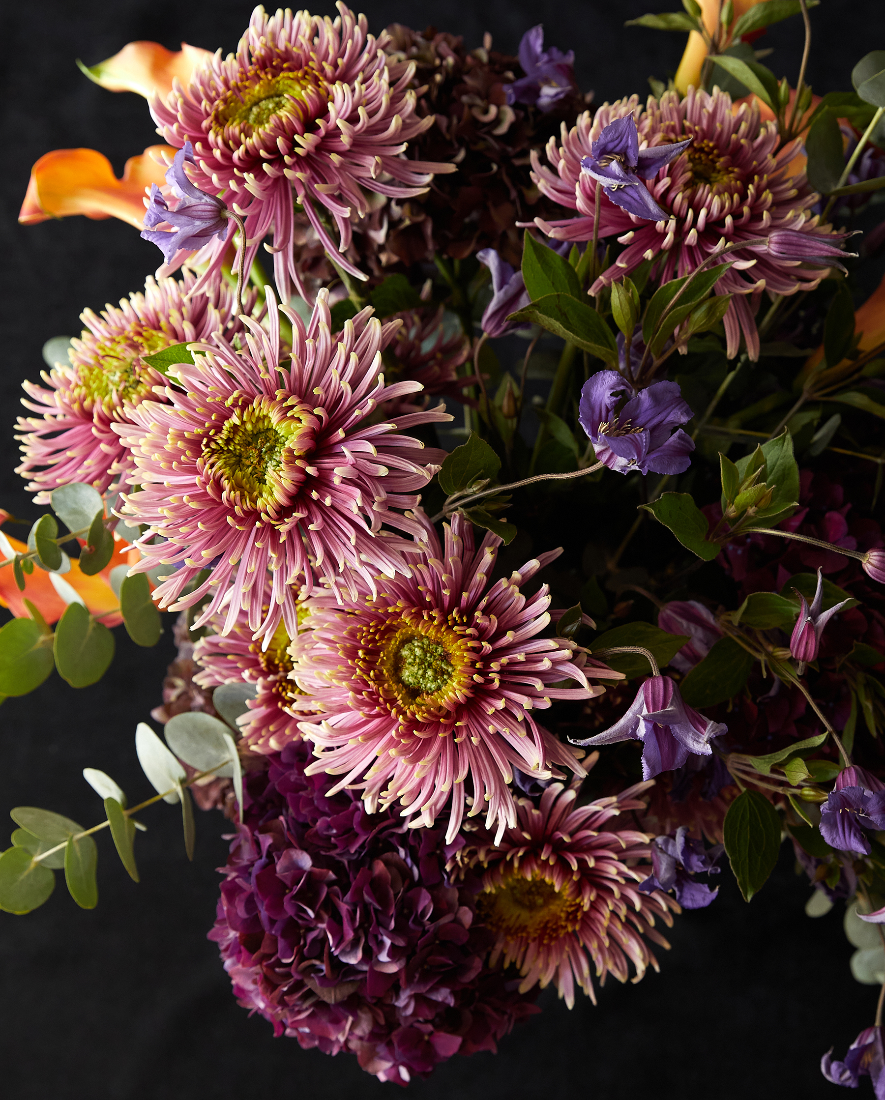 Chrysanthemums, hydrangea, zantedeschia - calla, clematis and eucalyptus